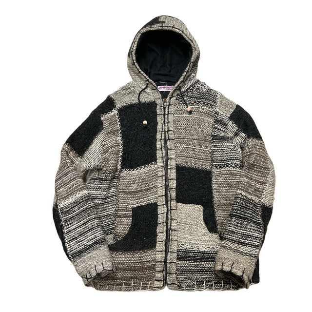 90s パッチワーク ニット ジップパーカー ジャケット 内フリース ネパール【XL】