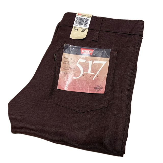デッドストック 90s Levis リーバイス 517 スタプレ ブラウン【W34】SCOVILL 10517-6128 色はブラウン 100% POLYESTER SCOVILL ジッパー MADE IN USA サイズ表記:W34L30 実寸:W34 L30 ウエスト 87cm 股下 77.5cm 全長 114cm 腿幅 28.5cm 裾幅 23.5cm コンディション:デッドストックのキレイな良い状態です。