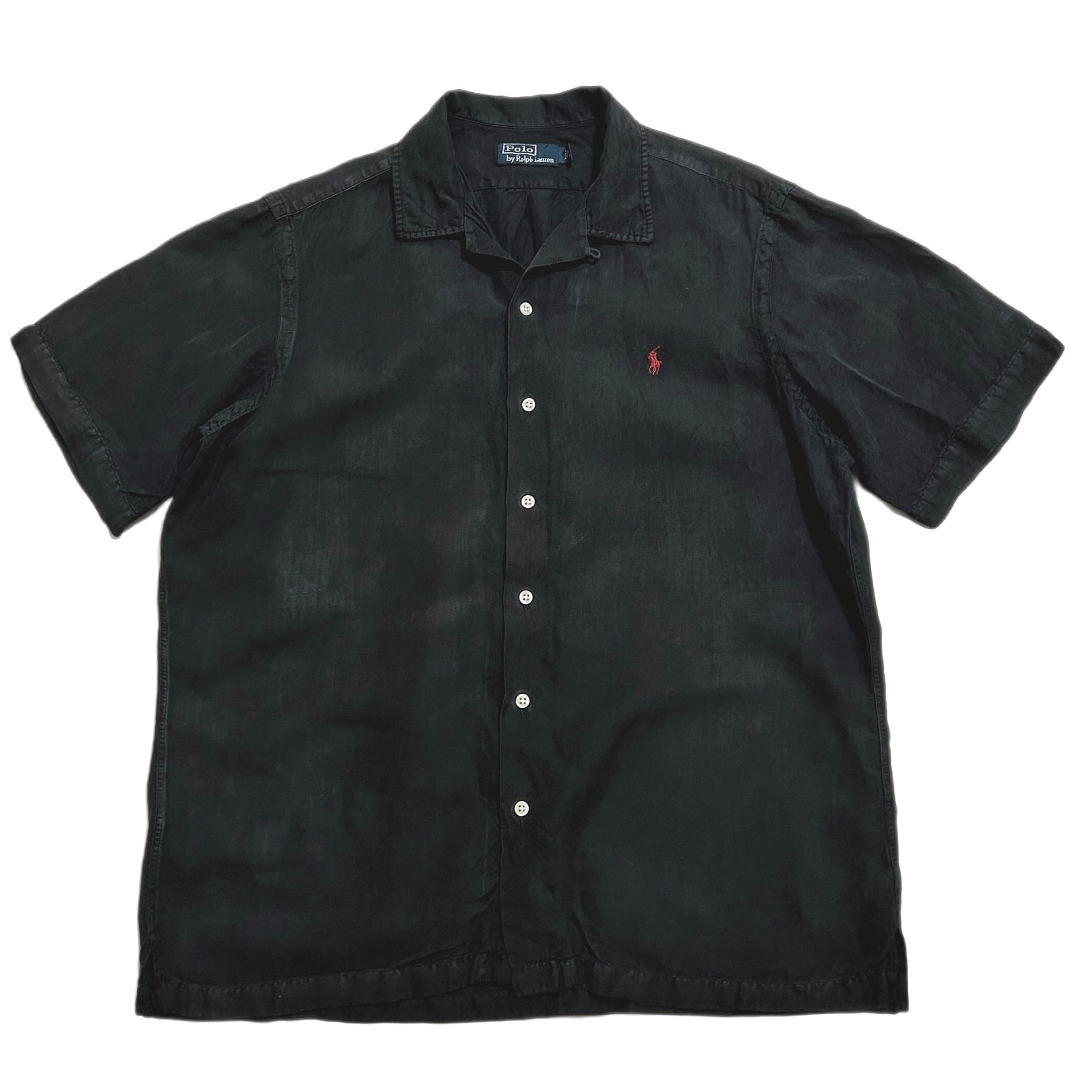 90s POLO RALPH LAUREN ポロラルフローレン オープンカラー リネン/シルク ヘリンボーン シャツ ブラック 半袖【L】